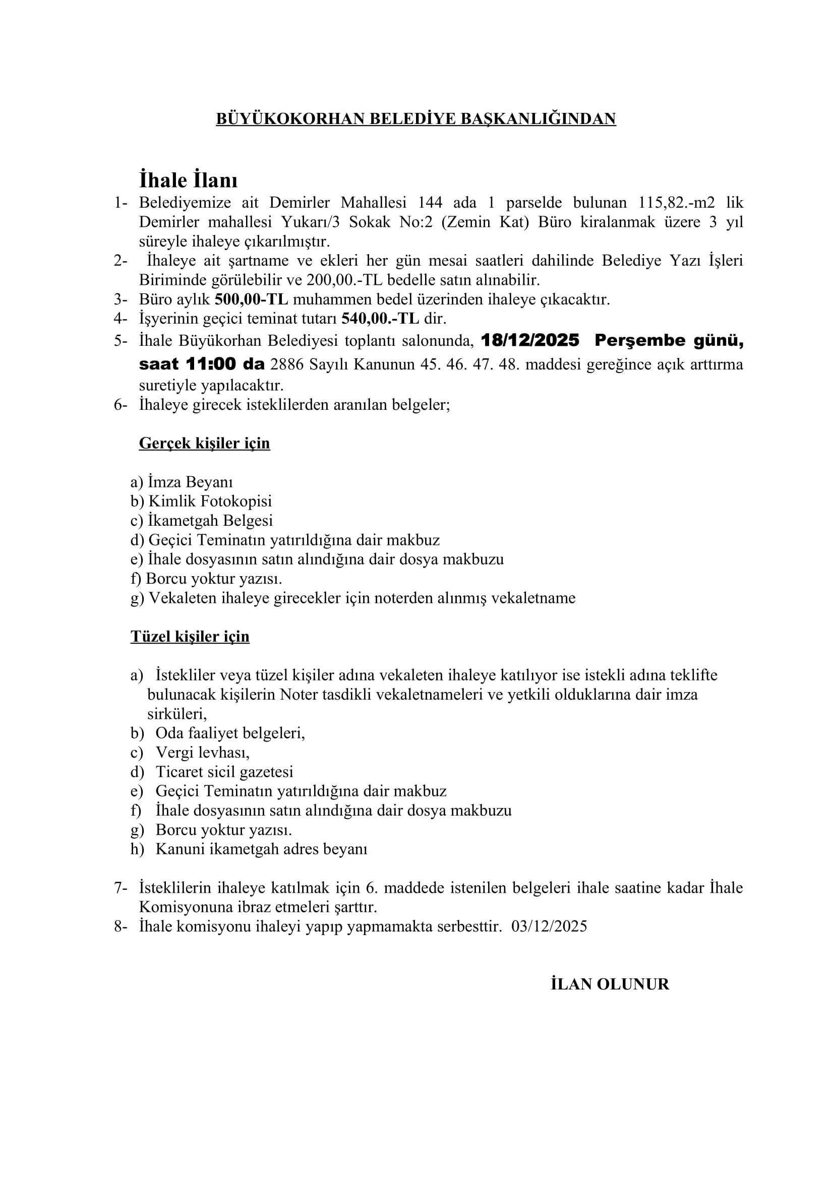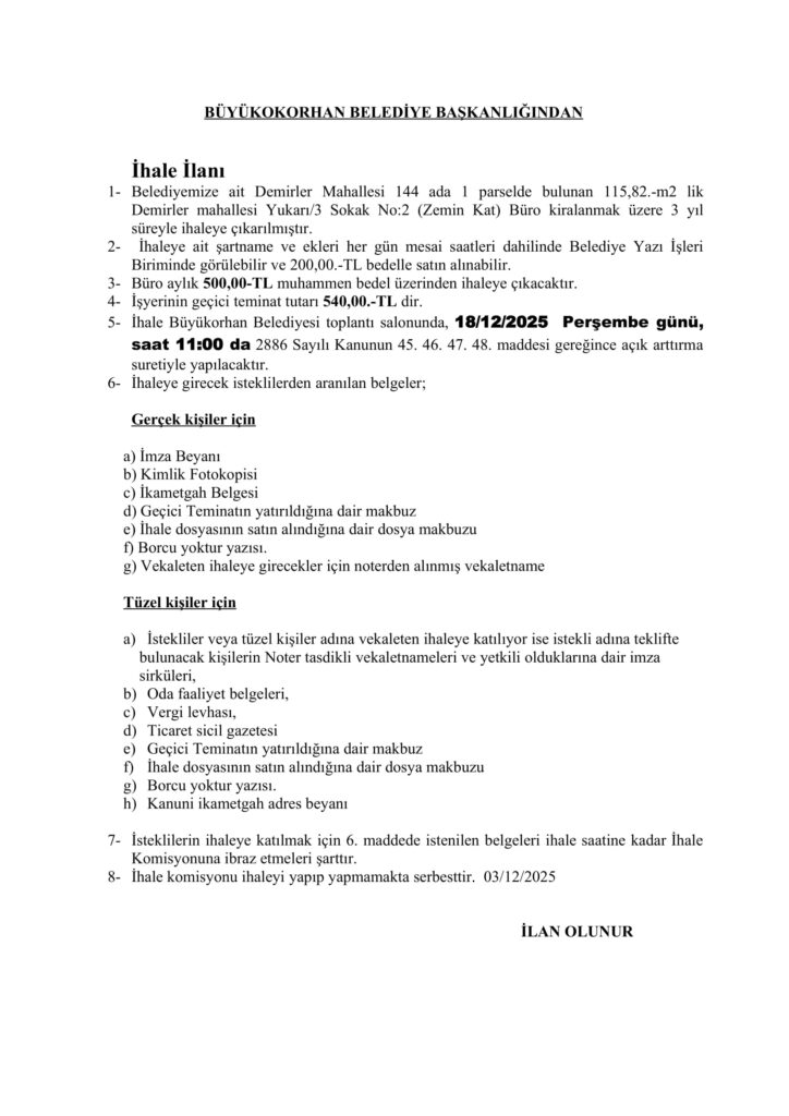 Düğüncüler Mahallesi İhale İlanı