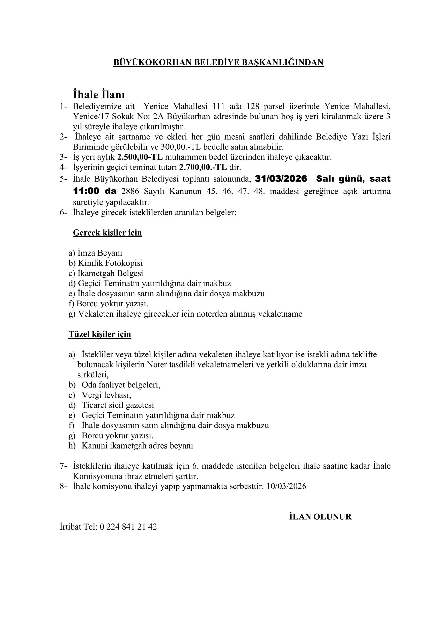Belediyemize ait Cumhuriyet Mahallesi, Atatürk_1 Caddesi No: 6C Büyükorhan adresinde bulunan boş işyeri kiralanmak üzere 3 yıl süreyle ihaleye çıkarılmıştır.